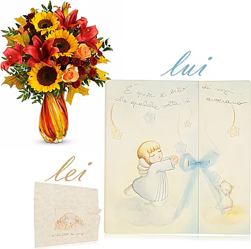 Male or female angel photo album, paired with a bouquet of sunflowers, roses, lilies and mixed seasonal flowers in warm colors, decorated with greenery.