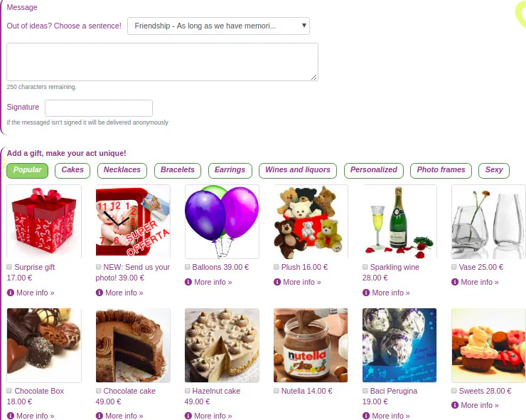 Furthermore, you can choose among the available additional gifts to enrich your act, and they will be delivered with the flowers.