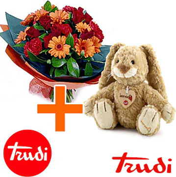 Peluche Trudi coniglio con bouquet dai toni caldi di fiori misti di stagione con roselline e gerbere, confezionato con verde decorativo. Un tenero regalo tutto da coccolare.
